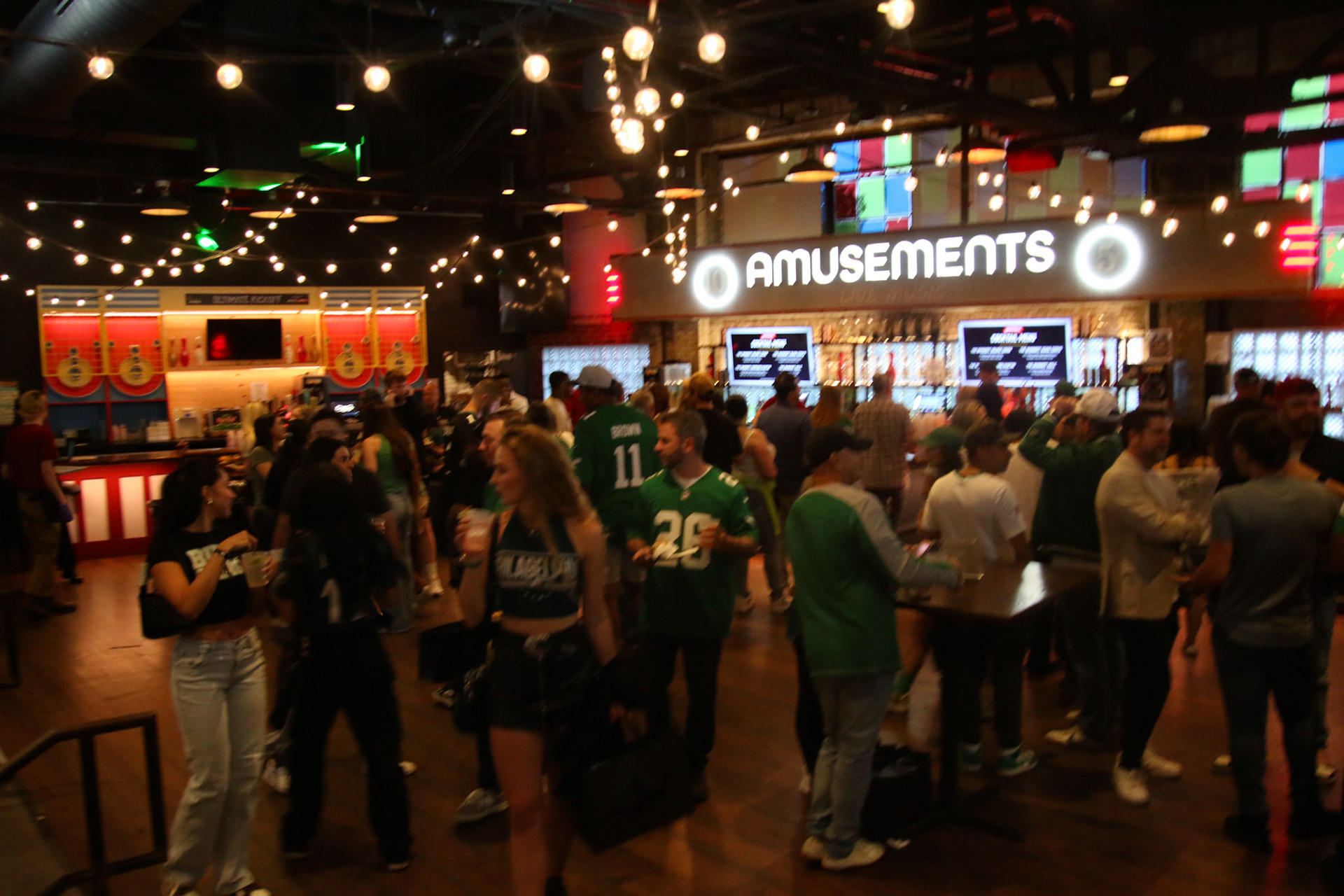 Live Game Viewing: All eyes were on the kickoff of the Eagles vs. Cowboys matchup streamed live on big screens throughout Brooklyn Bowl as fans cheered, interacted, and soaked up the atmosphere.